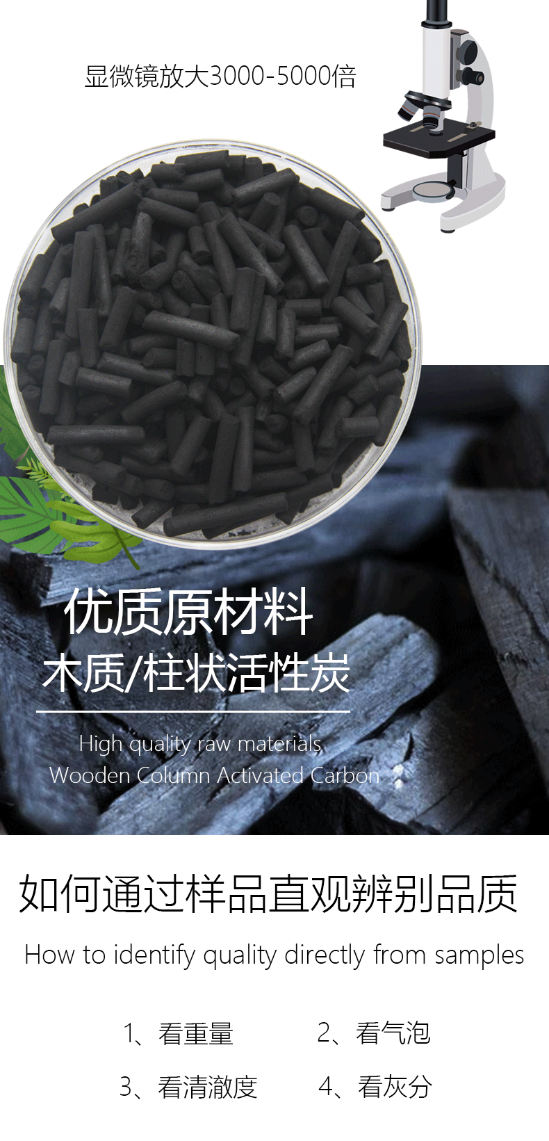 2、看密度。吸附功能好的活性炭,孔隙多,相對(duì)密度輕。在同等重量的情況下,性能好的活性炭比劣質(zhì)活性炭提及大許多。