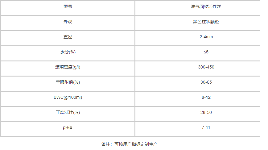 油氣回收活性炭主要用柱狀活性炭,碘值在800碘值以上,用于油氣的回收。包裝: 25kg/袋、噸包