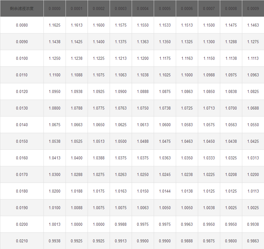 D—校正因子(通過剩余濾液濃度c從表1中查到);