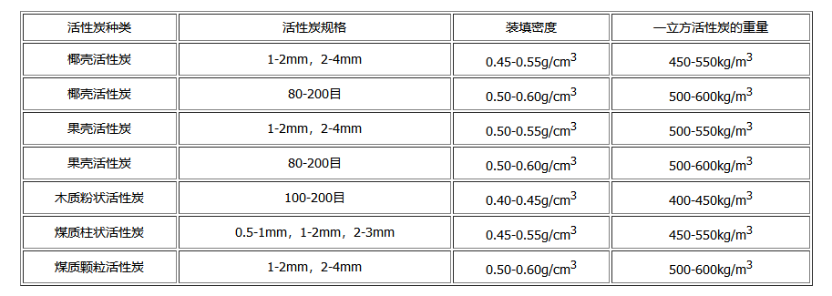 下表是竹之韻活性炭廠家根據(jù)產(chǎn)品的實(shí)際情況,為大家總結(jié)幾種不同類型活性炭產(chǎn)品的裝填密度,以及不同規(guī)格、種類活性炭一立方的重量,希望對大家有所幫助。